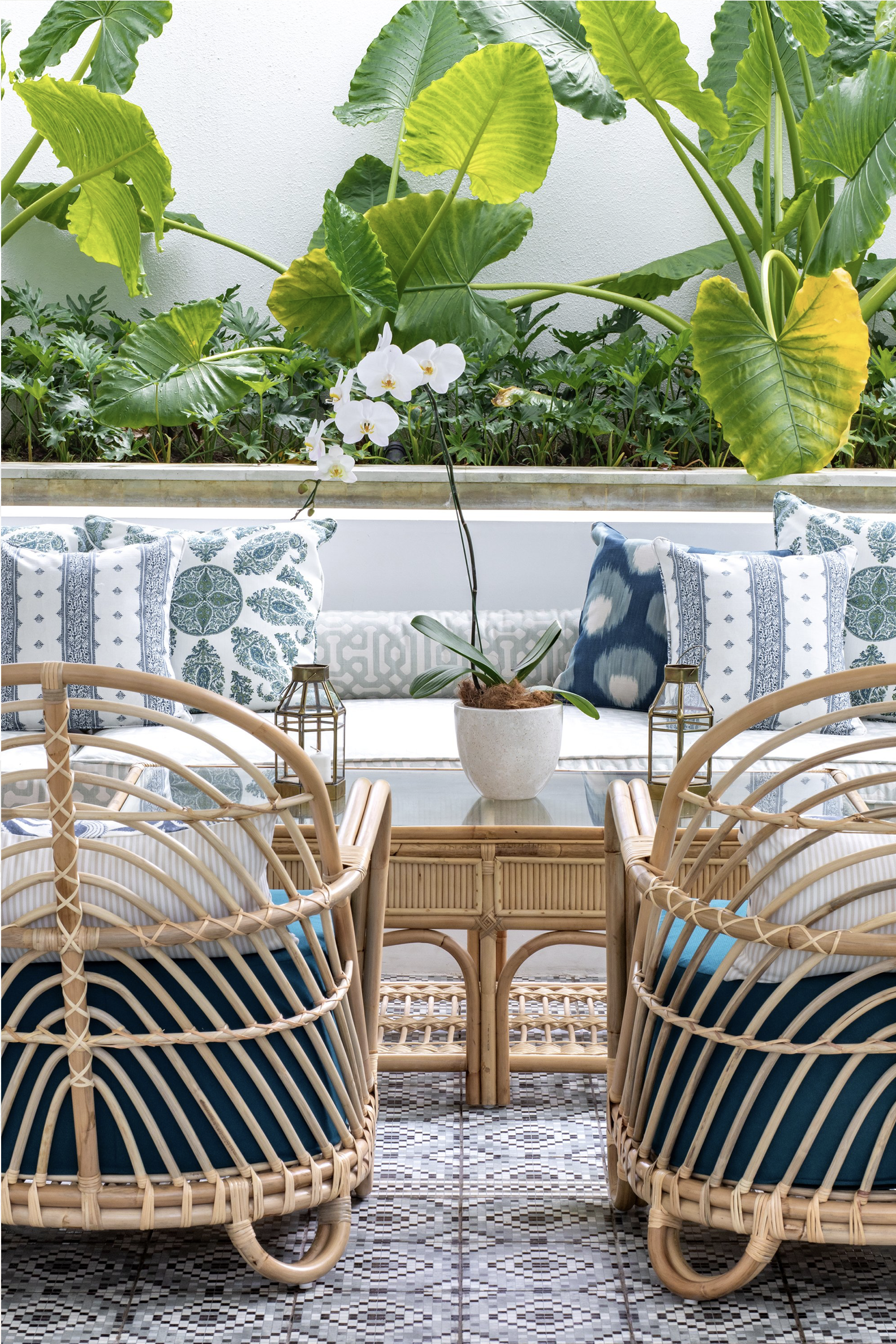 Don’t forget that the colour of the foliage outside your window - or in this case, adjoining your outdoor area - needs to be considered when choosing a palette. Here E&A Interiors make beautiful use of soft dusty blues to provide a counterpoint to the bright vibrant green of the foliage. The look is refined and sophisticated and relaxing and perfect for a nod towards life in the tropics.
